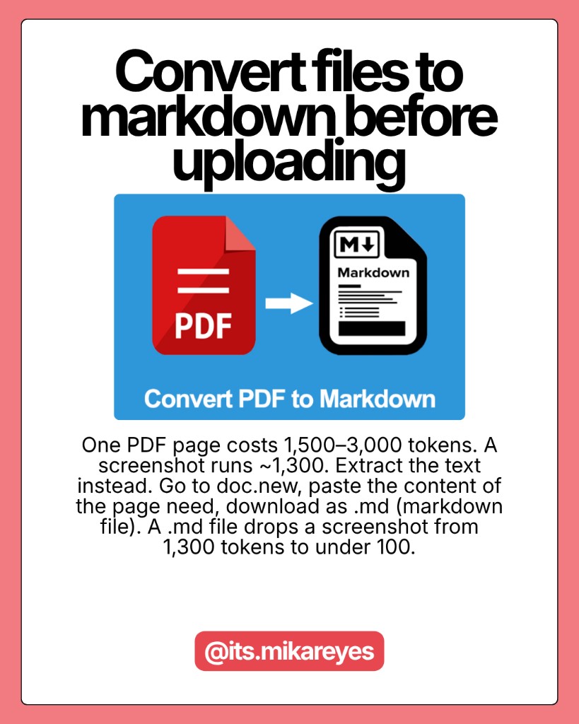 A single PDF page costs 1,500 to 3,000 tokens. A full screenshot runs around 1,300 tokens. DOCX and PPTX files carry metadata bloat you can't even see. Before uploading, extract the text. Copy the relevant sections into a plain text or markdown file instead.