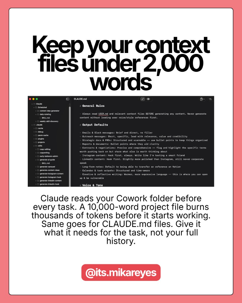 The rule applies to both: keep persistent context files under 2,000 words. Give Claude what it needs to do the work, not your entire life story. Shorter context means more tokens go toward actual output.
