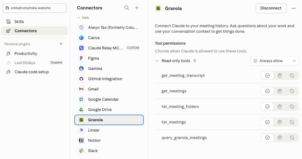 Claude needs to see your world before it can help you navigate it. The tools I have connected are Google Calendar, my email, Linear (my task tracker), Notion (where I keep my goals and notes), and Granola (where my meeting notes live).