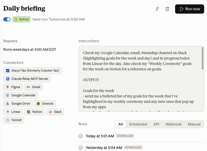 I don't manually trigger this every morning. I set it up as a scheduled task so it runs on its own and the output is waiting for me when I wake up.
