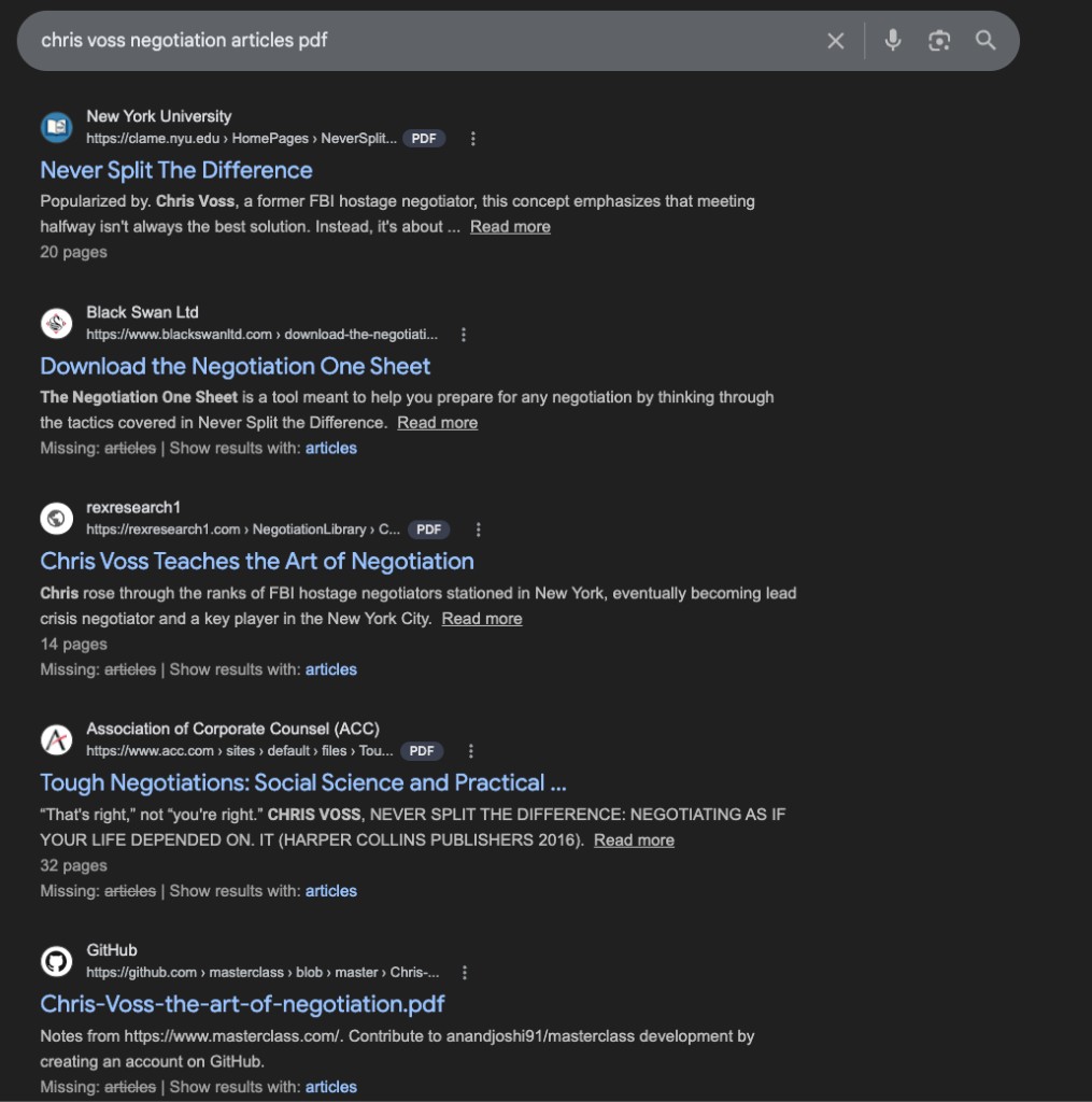 Search Chris Voss articles. Recommend to downlaod these PDFs and copy text into markdown files so your token usage is smaller