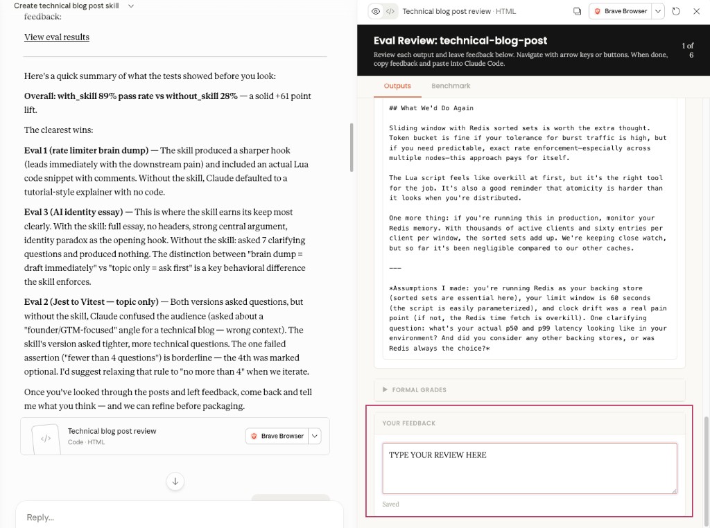 Review the evaluation of the skill and give feedback on the output.