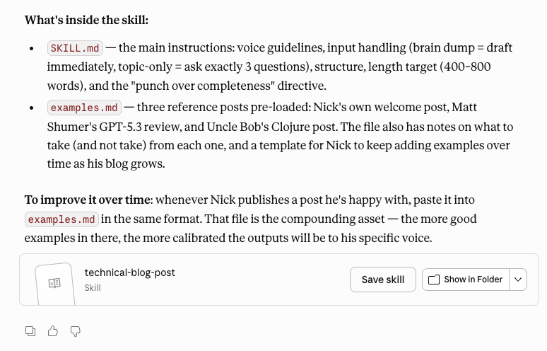 Most people have a folder of "prompts that worked." Skills are different. They live inside Claude as slash commands. When the right context appears, you say "write a LinkedIn post" or "run my weekly review," and the Skill fires without you doing anything. It's the difference between a recipe card you have to dig up and a chef who already knows your order.