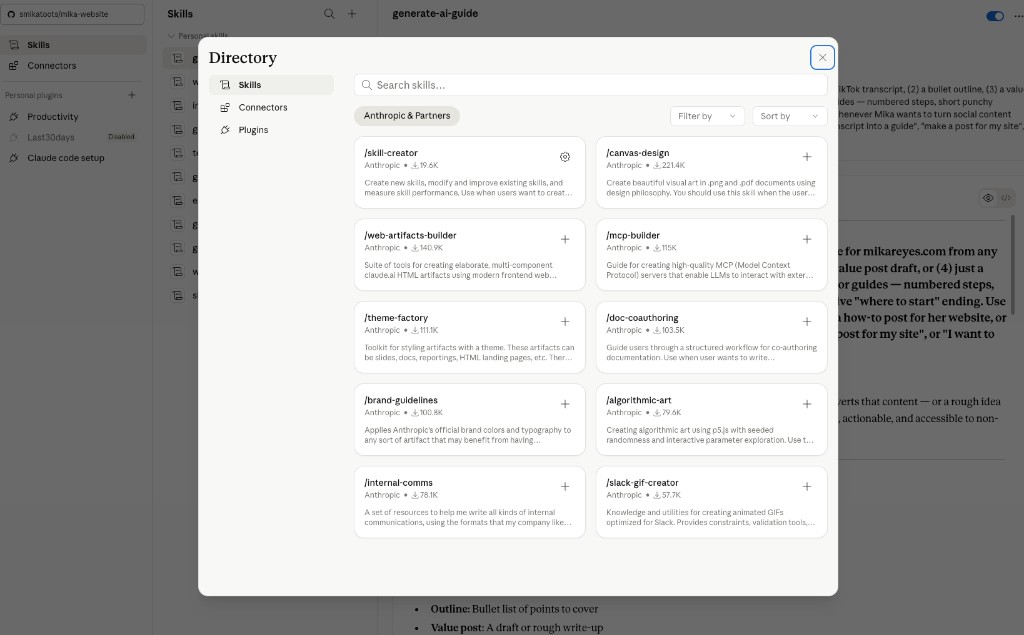 - When you have a conversation with Claude and realize it's long and repetitive enough to make a skill, ask Claude: "Please use /skill-creator to convert this conversation into a skill."