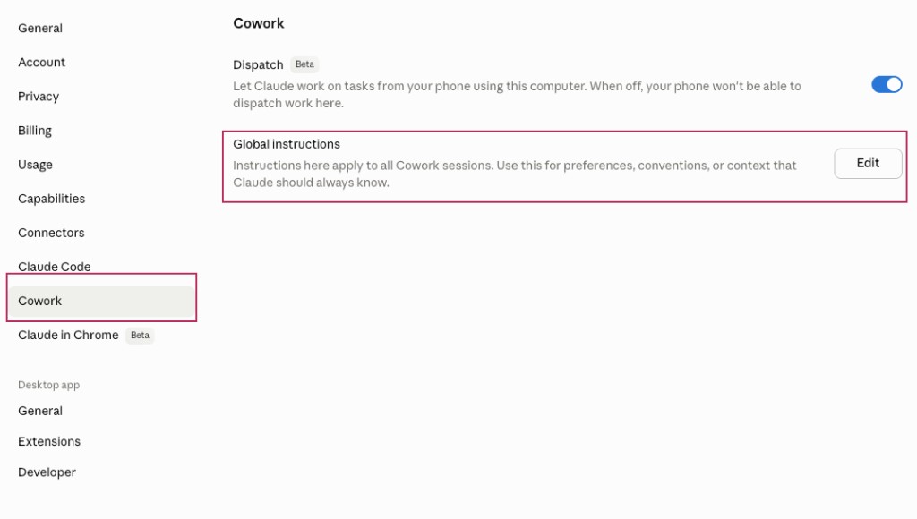 Open Claude, go to the Cowork tab, click Settings, then Global Instructions. This is where you tell Claude who you are: your job, what you're building, your preferences, how you like to communicate.