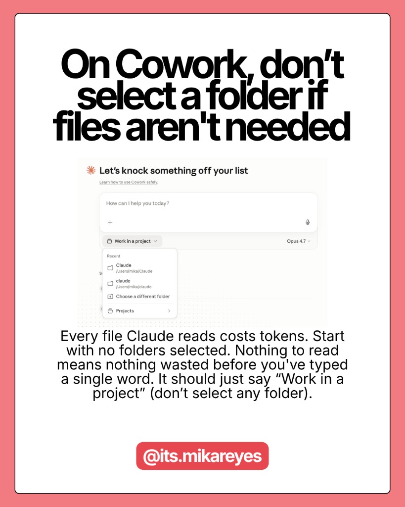 Every file Claude reads is tokens spent. If Claude doesn't need a file for this task, it shouldn't be reading it. For tasks that don't involve your files at all -- a quick email draft, a formatting request -- start the session with zero folders selected.