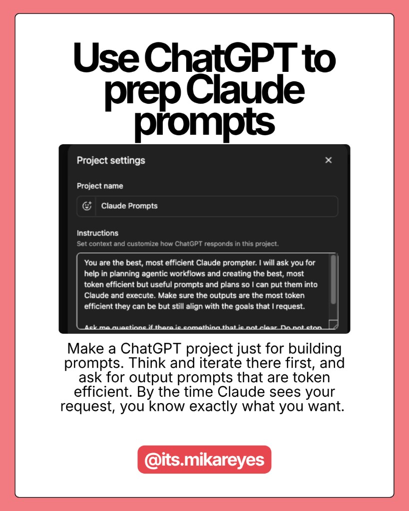 Create a dedicated ChatGPT project just for building clean, scoped prompts before you send them to Claude. Do all your thinking and iteration in ChatGPT first. By the time Claude sees your request, you know exactly what you want.