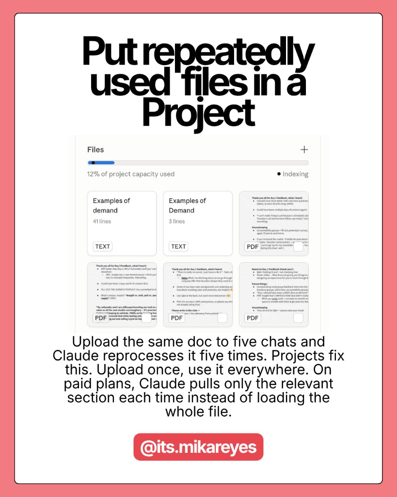 If you upload the same document to five different chats, Claude re-processes that file five separate times. Projects fix this. Upload once, and every future conversation in that project references it without reprocessing the full token cost.