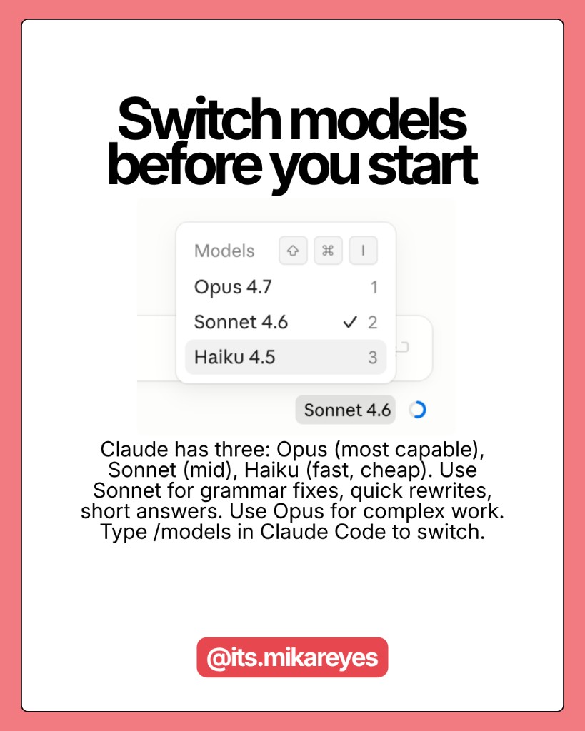 Within each product, the model matters too. Opus is Claude's most capable -- and most expensive -- mode. Sonnet handles grammar checks, brainstorming, reformatting, and short answers at a fraction of the cost. Haiku is for anything quick and repetitive. If a task would take Claude under 30 seconds to answer, it probably doesn't need Opus. Type /models in Claude Code to switch -- two clicks, done.