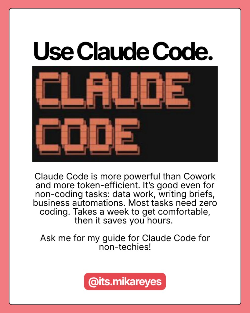 Most people outside of developers don't know this exists. Claude Code is more powerful than Cowork and more token-efficient. I use it to build data visualizations, write briefs for my tech team, and run automations. Zero coding required for most of it. The learning curve is real but it pays back fast.