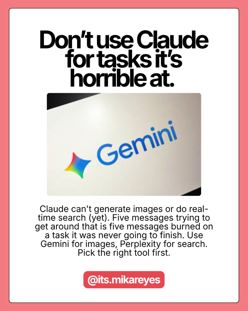 Claude can't generate images. If you've sent five messages trying to describe a visual and gotten text-based workarounds, you just burned five messages on a task Claude was never going to solve. Use Gemini.