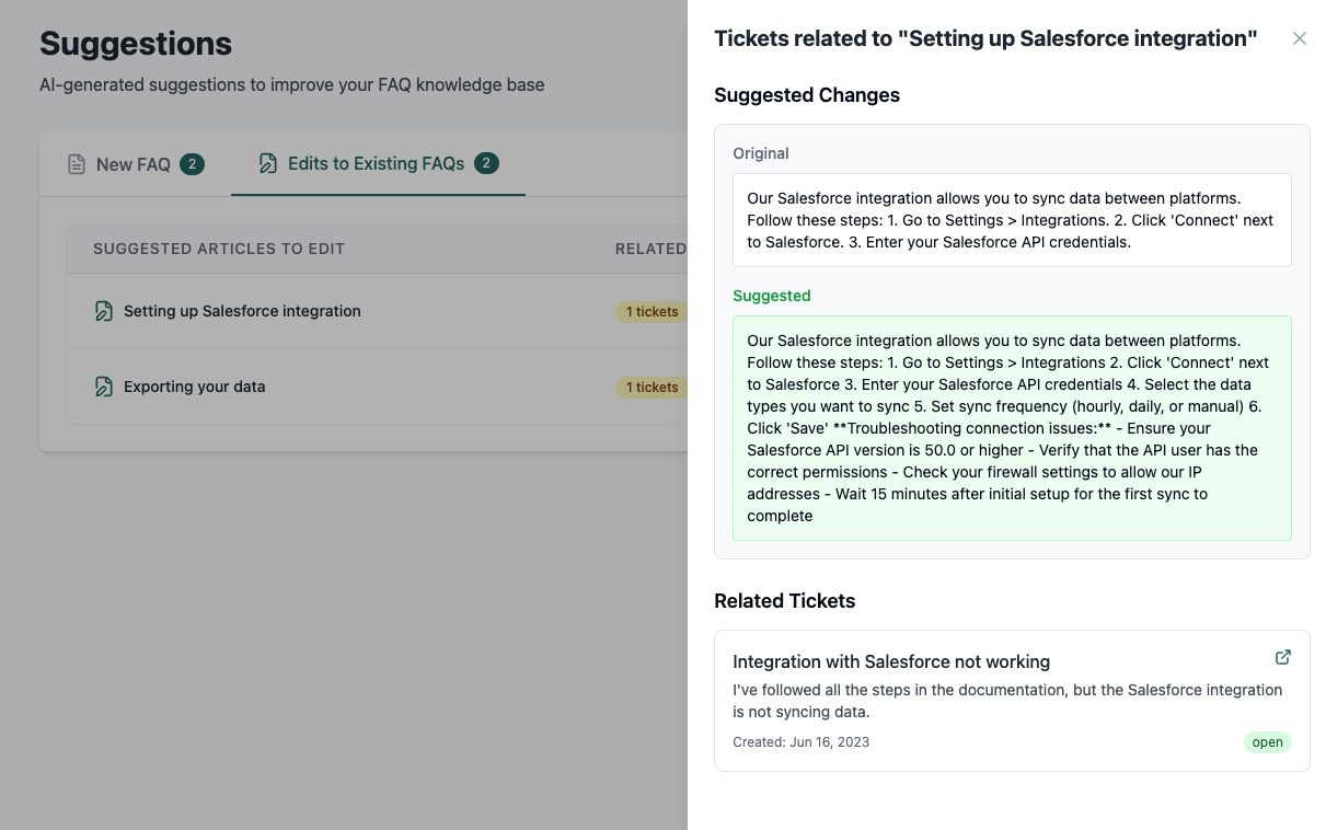- Edits: Show list of all existing FAQs and which ones have potential to be edited. When clicked, it shows the diff highlighting what the suggested edits are. It also previews all the support tickets with links out related to the edits to that FAQ.