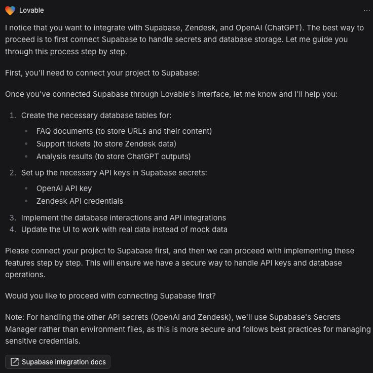 - If I want a backend, I should connect the backend off the bat. Lovable makes it easy with Supabase. I can also do authentication!