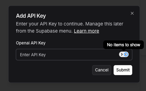 Ok it seems I don’t have a database to persist information. I’d like to add that in the code using Supabase so I can persist the data. I would also like to connect my ChatGPT API instance so I can actually analyze inputs and output the analysis information.