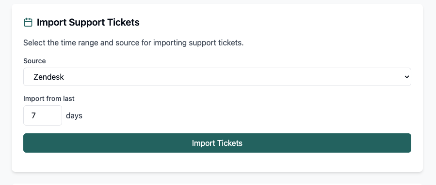- Default: Import the last 7 days of support tickets from Zendesk.