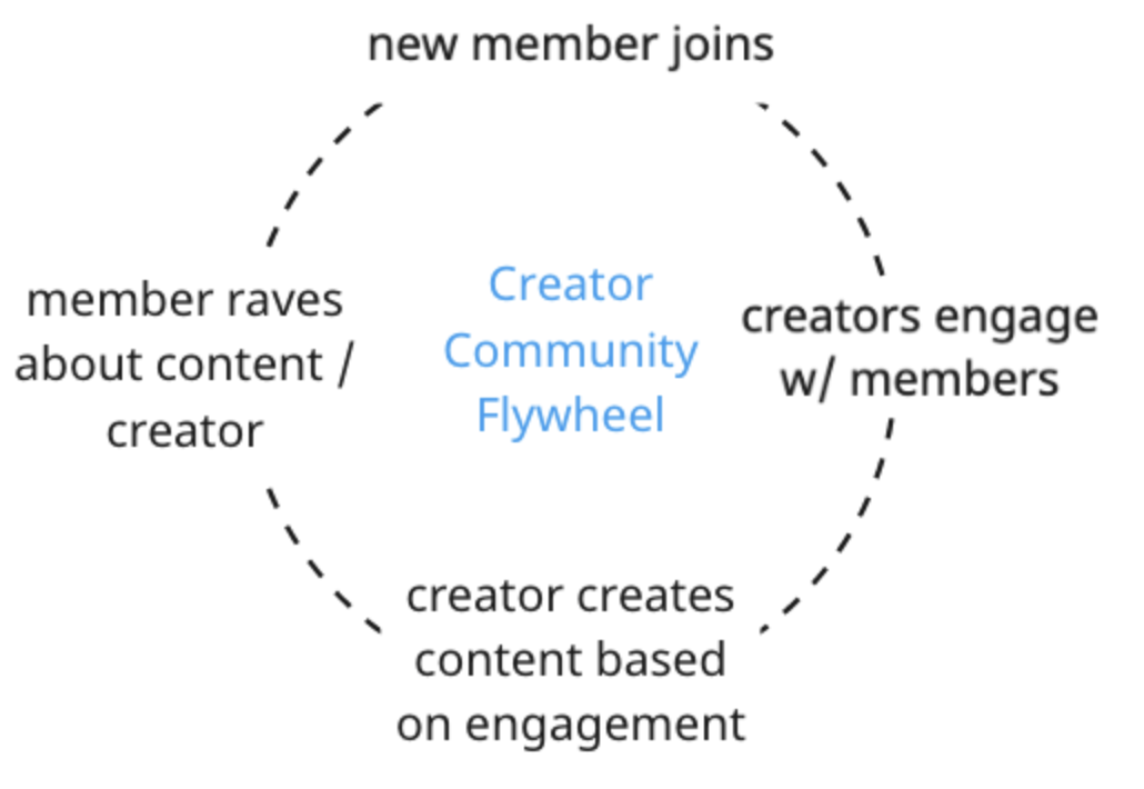Community doubles as a retention strategy (keeping users more invested) and acquisition strategy (via strong word of mouth). The flywheel builds a competitive moat that makes an offering better, for building products and building an audience for creators.