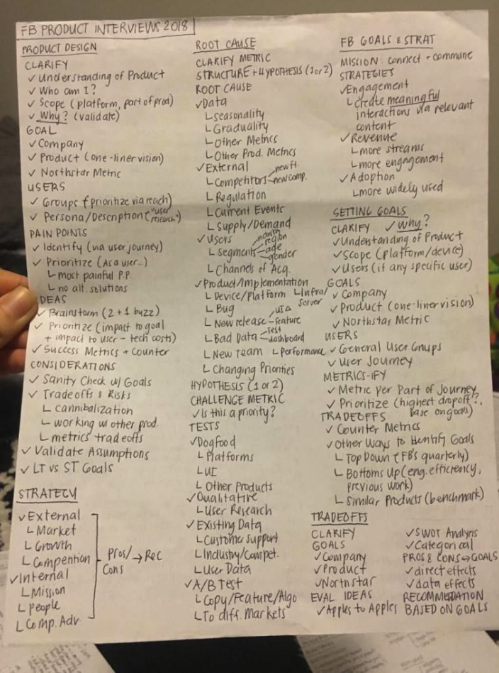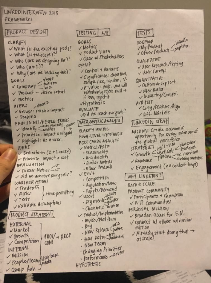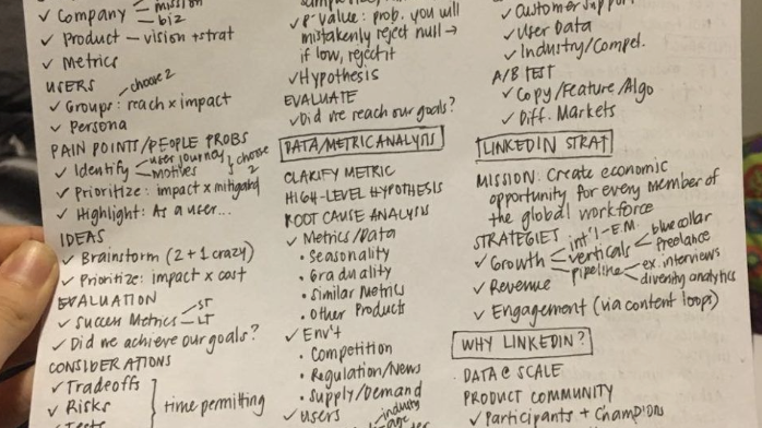 Lastly, here are some of my cheat sheets for my Facebook & LinkedIn interviews. Quite messy, but helped me organize all the frameworks in my head. Hope it helps!