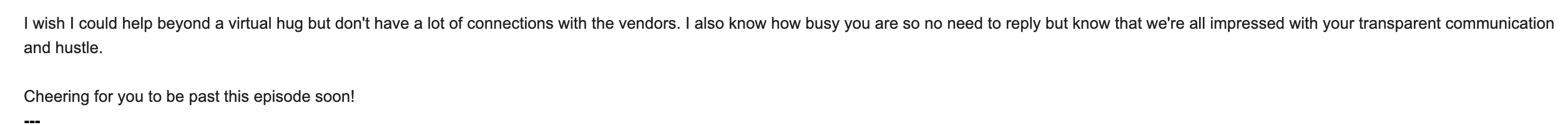 Ask 👏 for 👏 help 👏**.** Some founders shy away from sharing “bad news” to investors. Not me. That’s (supposedly!) what they are there for - to help in times of crises. I’m so grateful for key investors and other people in our network who really helped us with our negotiations. Also grateful for the ones who couldn’t necessarily helped but rooted for us and supported us along the way. It was also a great test of which investors actually read my investor emails and had our backs.
