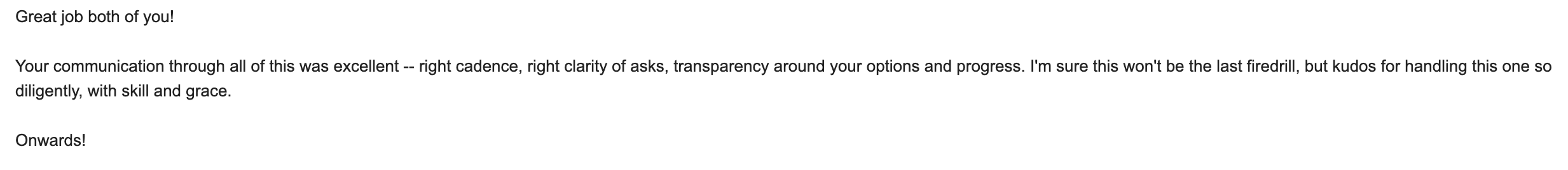 Hope the above helps you (and future me?!) navigate startup crises like a pro. Open to even more feedback on how we can do even better if this happens again.